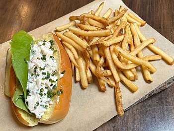 1/4 lb butter poached lobster tail, top sliced potato bun, lemon aioli, boston lettuce, chives, frites 36