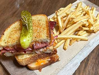 1/2 lb of house cured & smoked pastrami, butter toasted sourdough, cheddar, pickled onions + cabbage, bourbon mustard aioli, frites 28