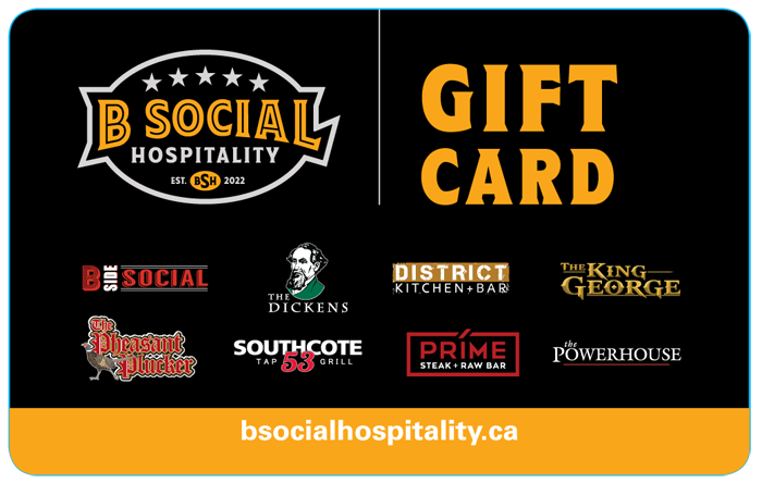 Gift card valid at all locations across Hamilton and Burlington including Southcote 53, The Powerhouse, District Kitchen + Bar, The Dickens Pub, The Pheasant Plucker, King George Pub, B-side Social and Prime Steak + Raw Bar.